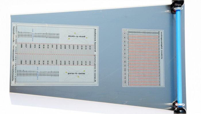 The pro-t-one balance board is designed to offer a precise, reliable, long-lasting and safe aesthetic effect to racquet matching professionals. It is the main tool of ” customization “of tennis, squash, beach tennis tools and in general allows you to perfectly balance the racket according to the playing characteristics you want to obtain by adapting the tool to the player’s peculiarities. The board is pure equipped with an exclusive and unprecedented table for the rapid calculation of the moment of inertia, commonly known as swingweight (kg / cmq) as a function of the weight (grams) and balance (cm) of the tool. The values shown are the theoretical calculation values, corrected with a comparative statistical coefficient able to make the calculation data closer to the real one of the rackets on the market. Obviously for the calculation of the real swingweight of the apparatus. in exam and it will be necessary to refer to a specific instrument for measuring the moment of inertia, the only way to obtain the real effective value, which changes not only from model to model but, it should be noted, from tool to tool, due to the different distribution of the masses inside the racket structure. It is handcrafted from a stainless steel plate with a brushed and laser cut finish; equipped with millimeter and inch scale, rotating drum and knobs or handwheels for accurate rotation and reading of the measurements. All pro-t-one products are created by hand right from the conception, realization and finishing phase. Any small defects or imperfections, the differences between piece and piece, customizations and variations are due to the absolutely artisanal workmanship in all phases, from the assembly of the individual parts to the finishing, such as to make the object not a serial product but a unique and unrepeatable piece. This effect is desired and takes up the philosophy of personalized creation and “tailoring” work as a means for creating tools destined to stand out and last.
